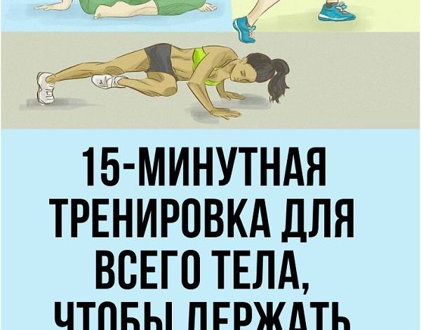 Примером 15-минутной тренировки для всего тела может быть следующий комплекс упражнений: 1) бег на месте — 1 минута; 2) отжимания — 1 минута; 3) приседания — 1 минута; 4) планка — 1 минута; 5) подтягивания — 1 минута; 6) выпады — 1 минута; 7) скручивания — 1 минута; 8) прыжки на месте — 1 минута; 9) отдых — 1 минута. Повторите этот комплекс упражнений два раза, чтобы выполнить 15-минутную тренировку.